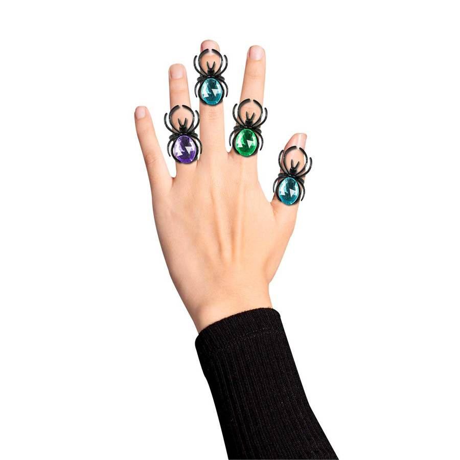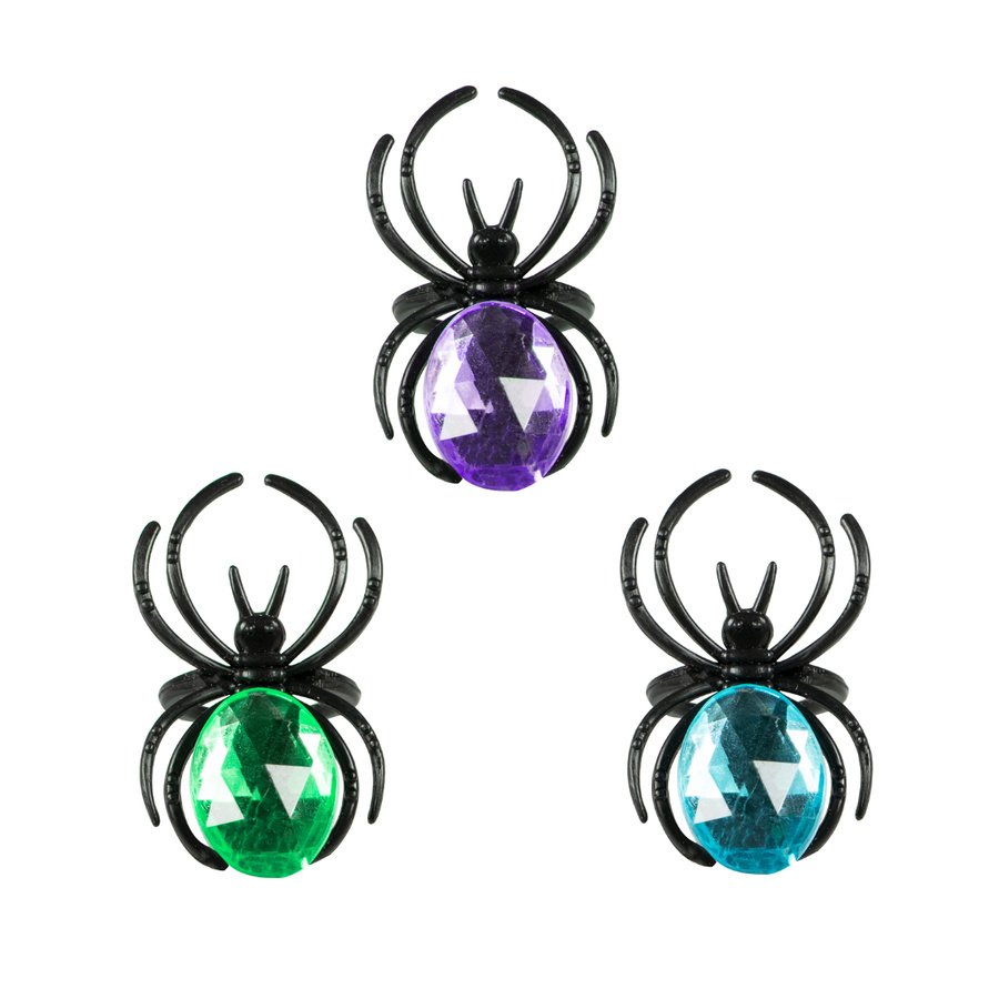 - Pierścionki w kształcie pająków. Na pierścionkach znajduje się ozdoba imitująca mieniący się kryształ.