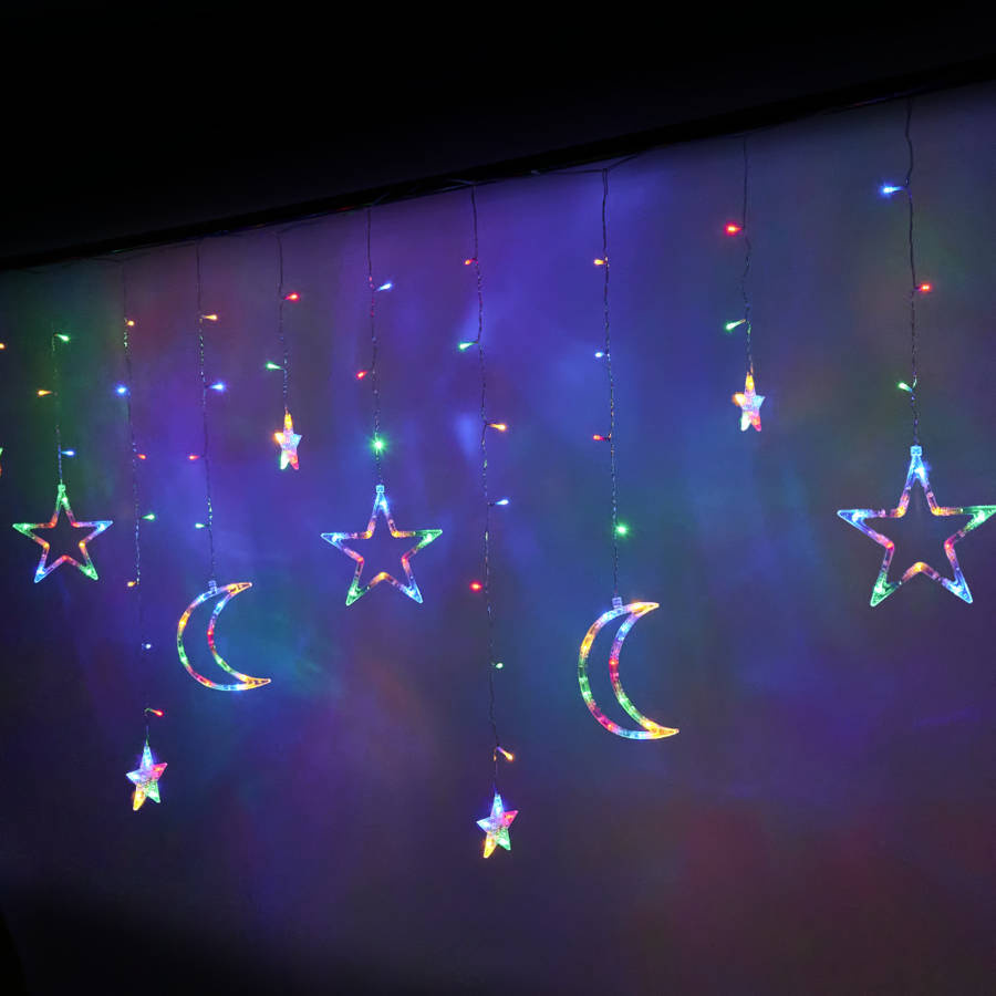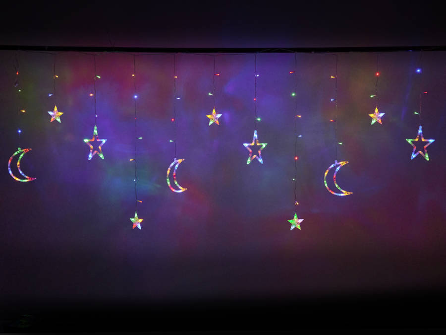 - Fantastyczna kurtyna LED w księżyce i gwiazdy, która nada świątecznego klimatu każdemu wnętrzu. Kolor lampek: multikolor. Zasilanie: sieciowe. Dł. kurtyny: 2.5cm. Dł. kabla zasilającego: 3m. Wym. opakowania: 20x20x13cm.