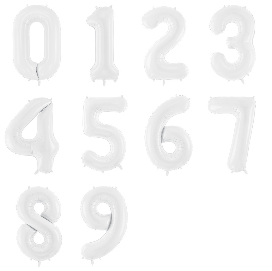 • Balon foliowy CYFRA w kolorze białym, wysokość ok. 86 cm (ok. 39-40").