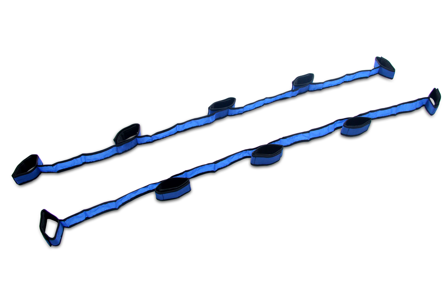 Produkt wykonany z mocnej taśmy poliestrowej, do której dołączone są paski na stopy zapinane na rzepy.