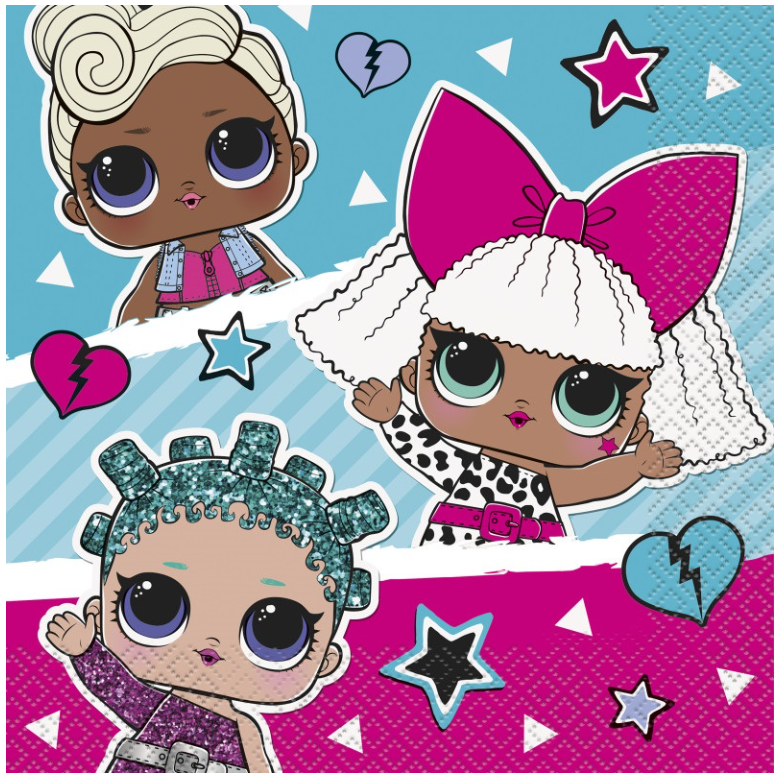 - Serwetki papierowe z motywem LOL Surprise, 33x33 cm, 16 szt. Niezwykle praktyczne podczas organizacji przyjęć, imprez, urodzin. Cena za opakowanie.