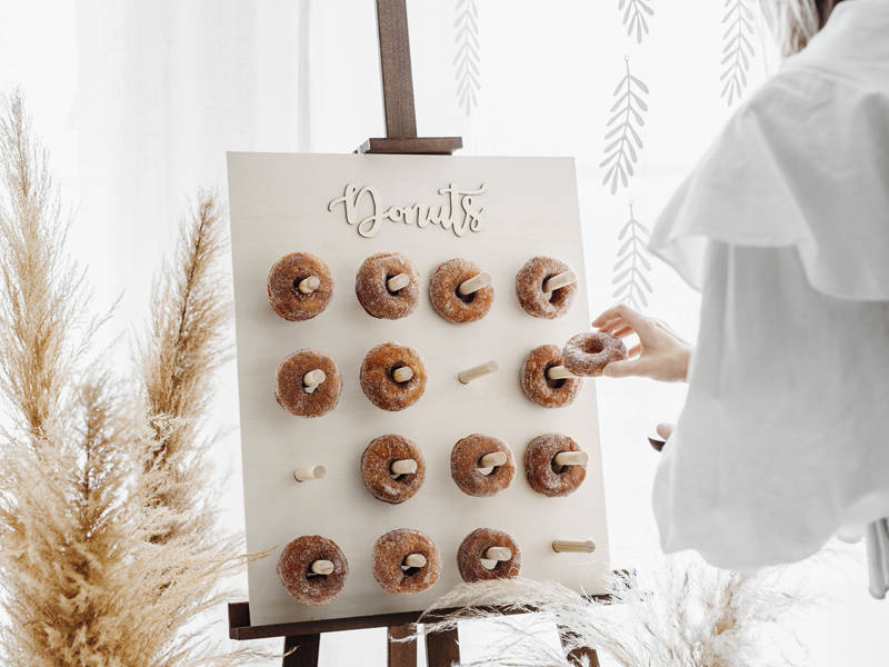 Drewniana ścianka na donuty, która idealnie wkomponuje się w wystrój słodkiego stołu na weselu.