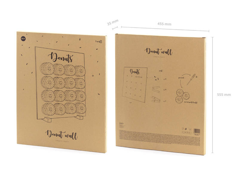 • Drewniana Ściana na Donuty z 16 kołkami do samodzielnego zamontowania, szerokość ok. 45 cm, wysokość ok. 55 cm.