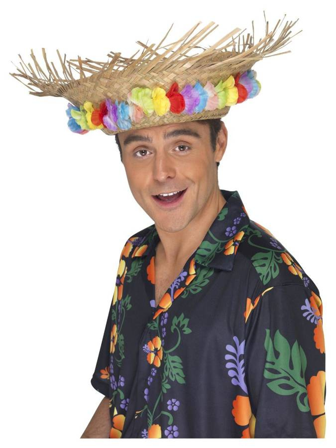 Nakrycie głowy w stylu hawajskim. Ozdobiony dookoła hawajskimi kwiatami w różnych kolorach.