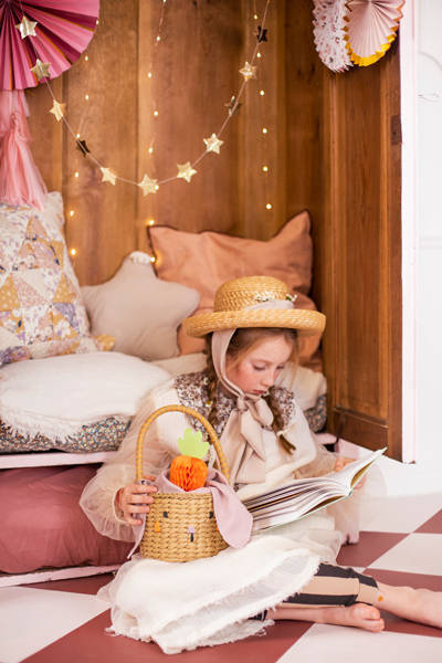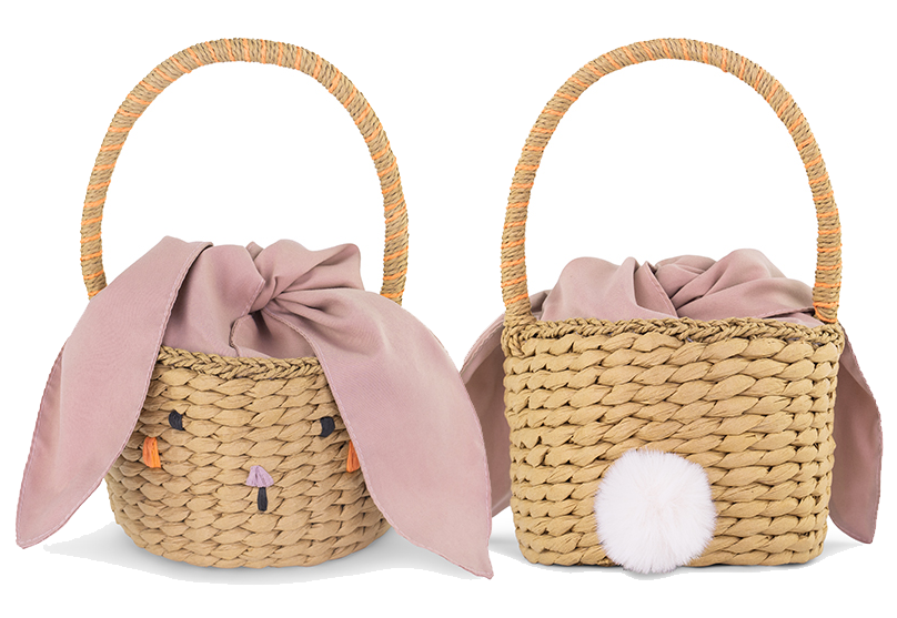• Koszyk Króliczek wykonany z papieru z materiałowymi uszami w kolorze różowym, wysokość ok. 28 cm, średnica ok. 17 cm.