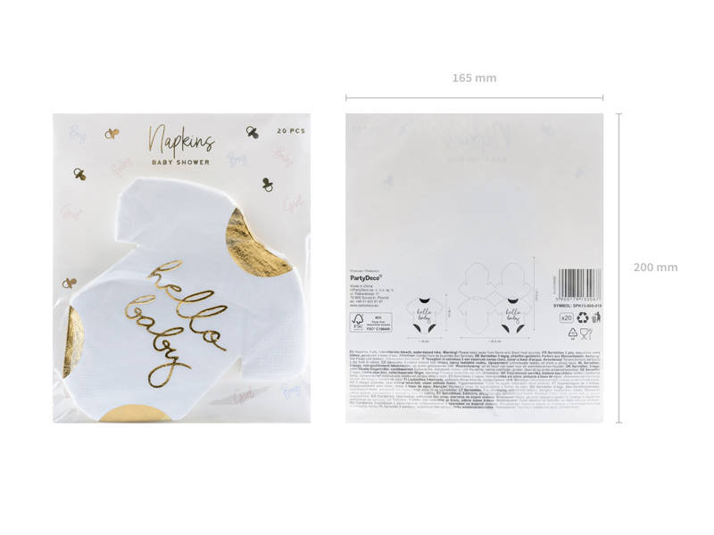 - Serwetki w kształcie śpioszków w kolorze białym ze złotym metalizowanym napisem Hello Baby. Wymiary po rozłożeniu ok. 32.5 x 31.5 cm, rozmiar po złożeniu ok. 16 x 16 cm. Cena za opakowanie.