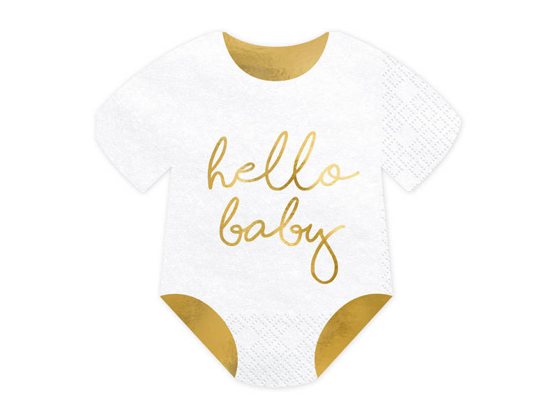 Papierowe, białe serwetki w kształcie dziecięcych śpioszków, z metalizowanym, złotym napisem hello baby.