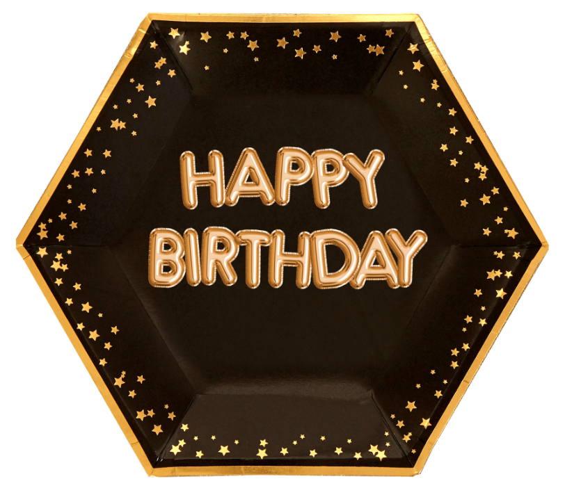 Talerzyki papierowe czarne w złote gwiazdki - HAPPY BIRTHDAY