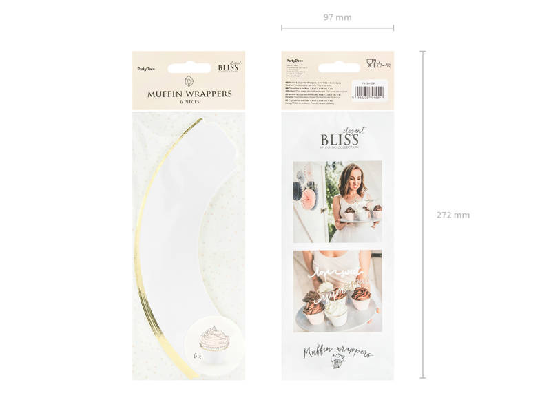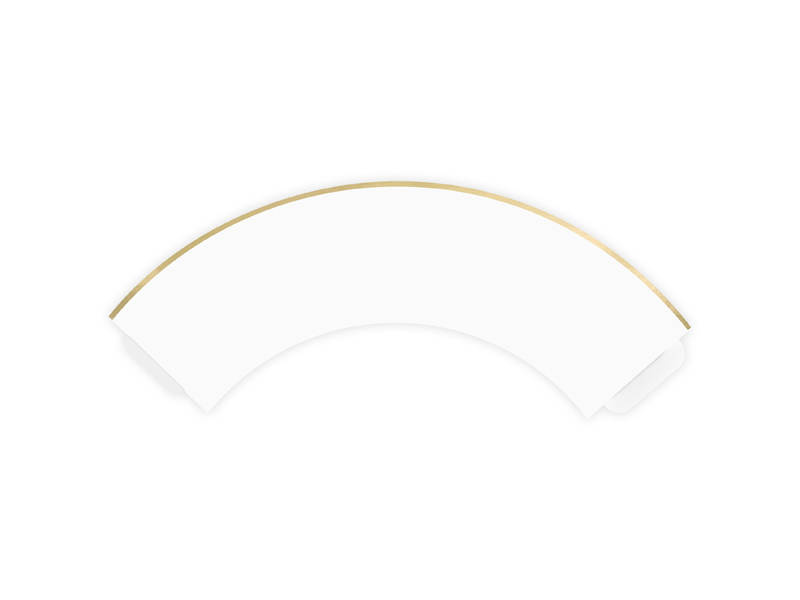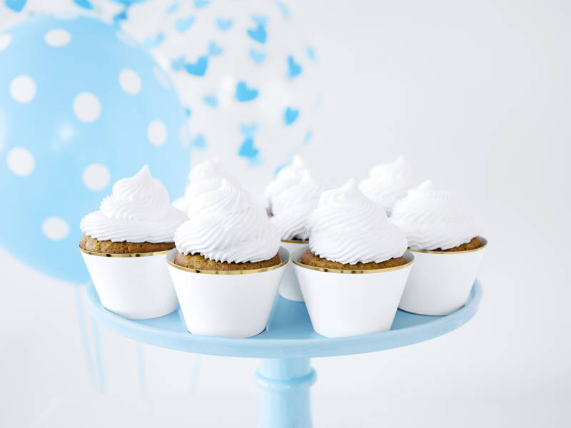 - Papilotki na muffinki Elegant Bliss w kolorze białym, ze złotymi metalizowanymi brzegami. Wymiary po złożeniu ok. 4,8 x 7,6 x 4,6 cm.