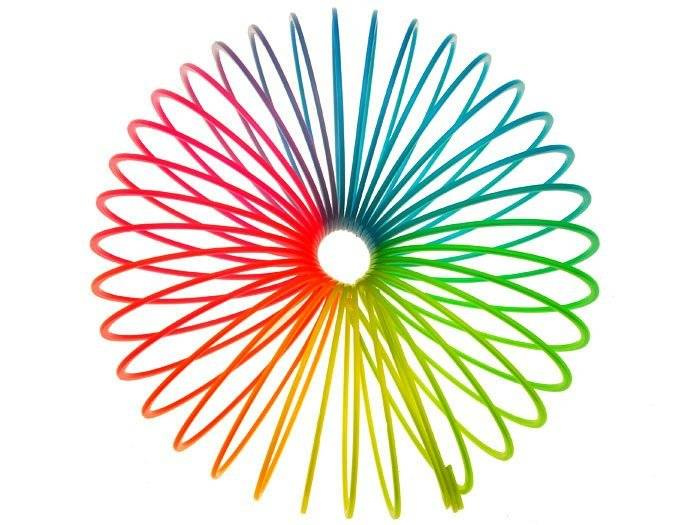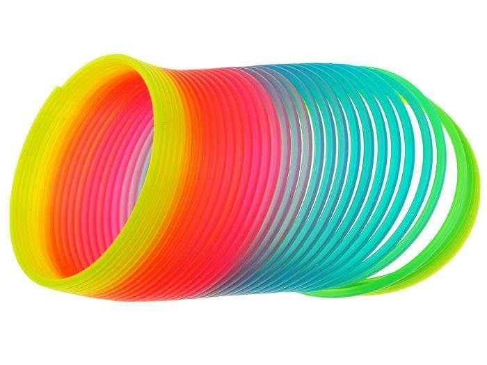 Tęczowo perłowa sprężysta sprężyna o średnicy ok. 7,5cm i wysokość 6,5cm zapewni wiele frajdy podczas zabawy.