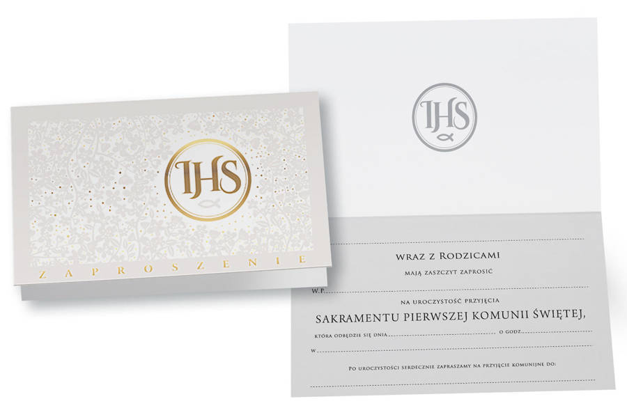 - Zaproszenie na uroczystość Pierwszej Komunii Świętej wraz z kopertą w formacie 17 x 10 cm. Zaproszenie wykonane na białym, perłowym papierze z napisem i złotymi zdobieniami.