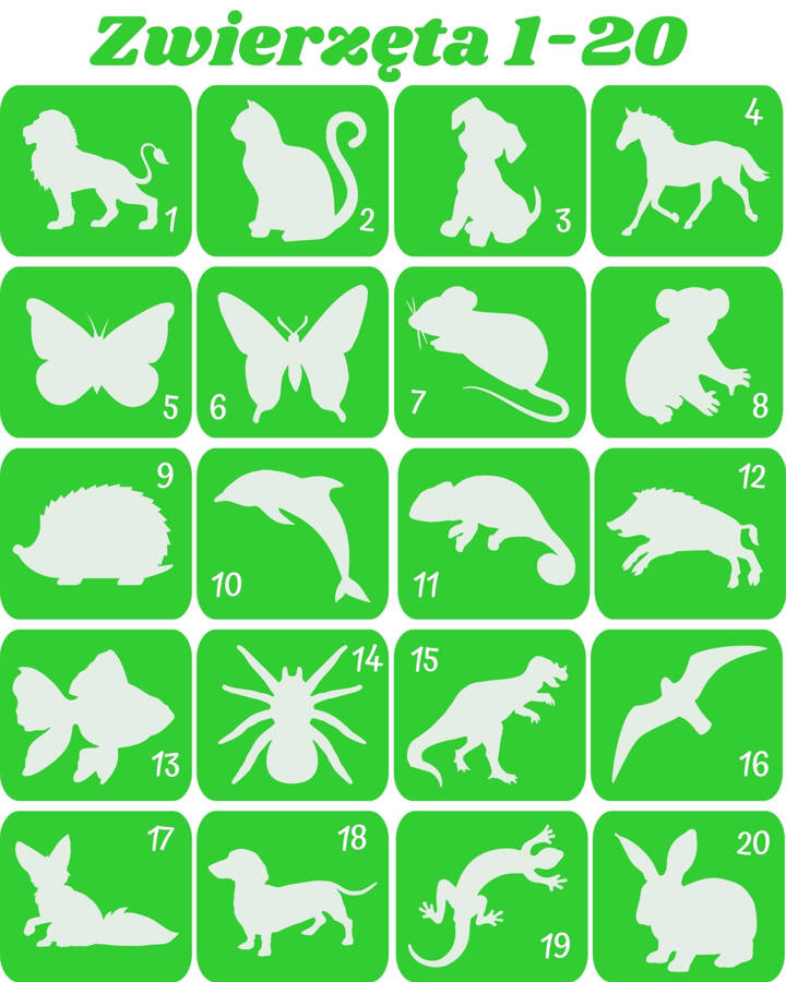 Zestaw zawiera 20 sztuk szablonów o zbliżonej tematyce. W zestawie znajdziesz wszystkie wzory pokazane na zdjęciu głównym.