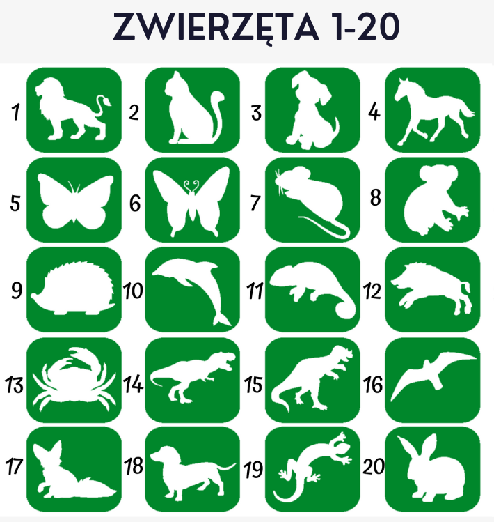 - W opakowaniu znajduje się 20 sztuk szablonów tematycznych, każdy wycięty osobno.