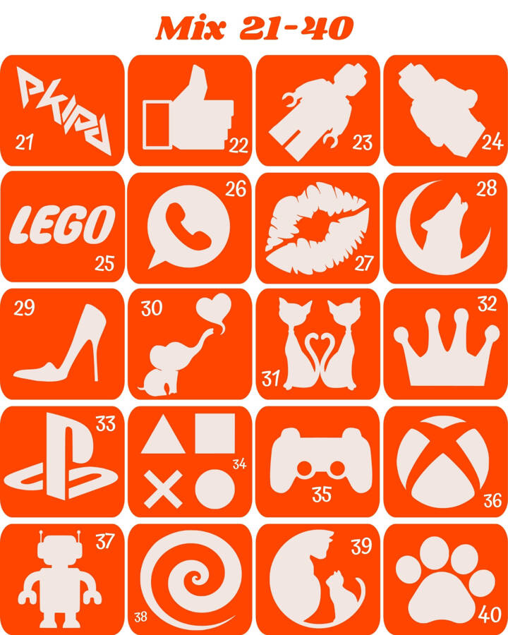 - Zestaw zawiera 20 sztuk szablonów do tatuaży brokatowych o zbliżonej tematyce. W zestawie znajdziesz wszystkie wzory pokazane na zdjęciu głównym. Wymiar 1 szablonu ok. 5,8 x 5,2 cm. Cena za zestaw.