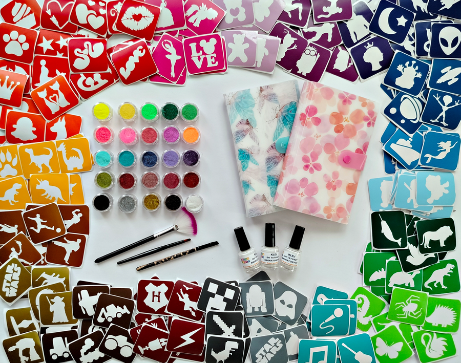 Zestaw 20 szablonów do wykonywania tymczasowych tatuaży brokatowych na ciele.