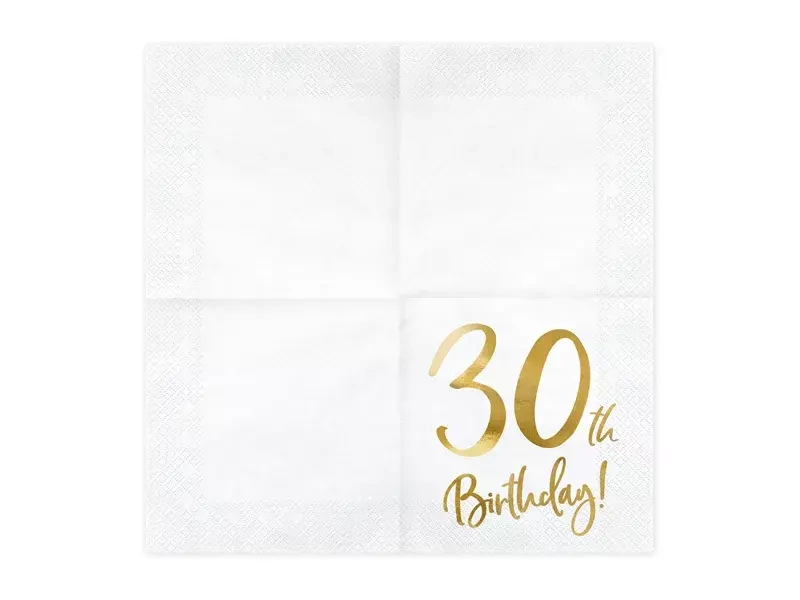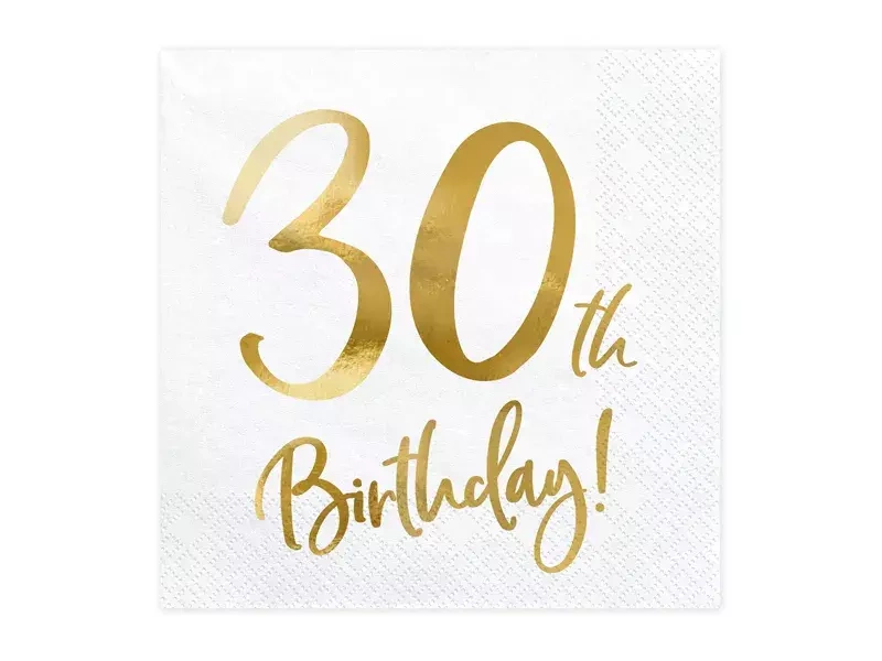 Białe serwetki papierowe z nadrukiem "30th Birthday!" w kolorze metalizowanego złota.