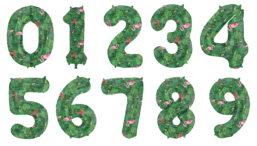 • Balon foliowy CYFRA z nadrukiem w motywie dżungli i tropików. Wysokość ok. 86 cm. Cena za sztukę.