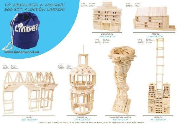 - Klocki konstrukcyjne Linden przeznaczone do swobodnego konstruowania budowli przestrzennych, ze specjalnym wskazaniem dla dzieci w wieku przedszkolnym oraz wczesnoszkolnym. Zestaw 300 szt.