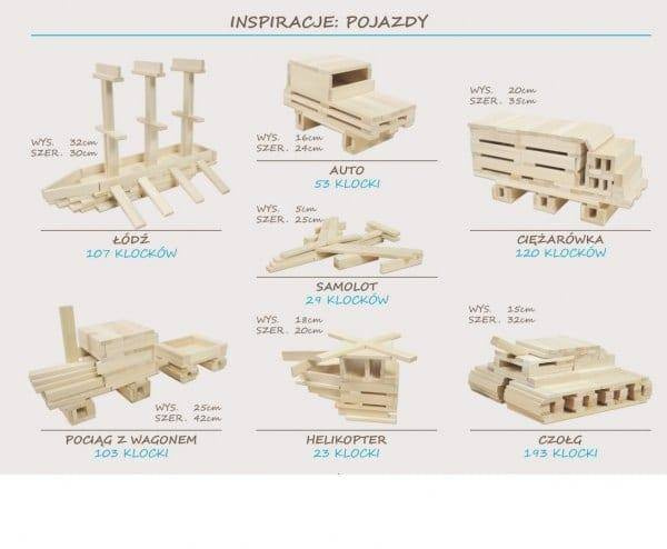 Wszystkie klocki mają identyczny kształt i rozmiar: mają wygląd niewielkich deseczek.