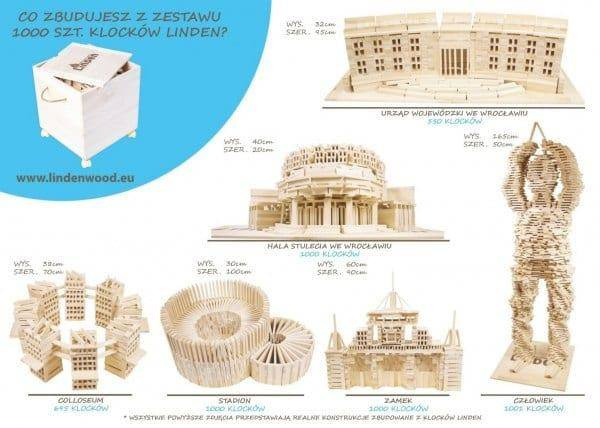 - Klocki konstrukcyjne Linden przeznaczone do swobodnego konstruowania budowli przestrzennych, ze specjalnym wskazaniem dla dzieci w wieku przedszkolnym oraz wczesnoszkolnym. Zestaw 1000 szt. + katalog z instrukcjami.