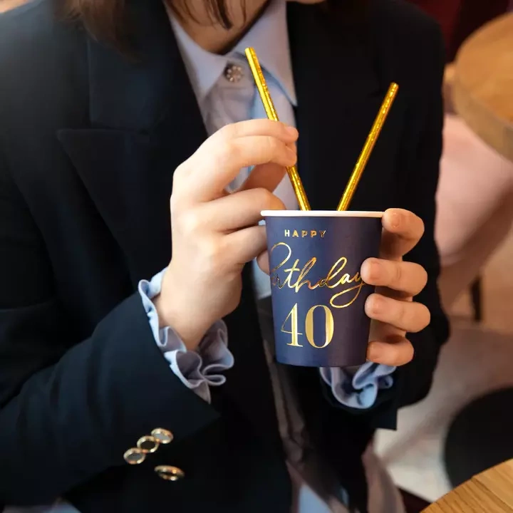 - Jednorazowe, papierowe kubeczki o pojemności 220 ml. Kubeczki w kolorze granatowym, zdobione złotym napisem urodzinowym. Cena za opakowanie 6 szt.