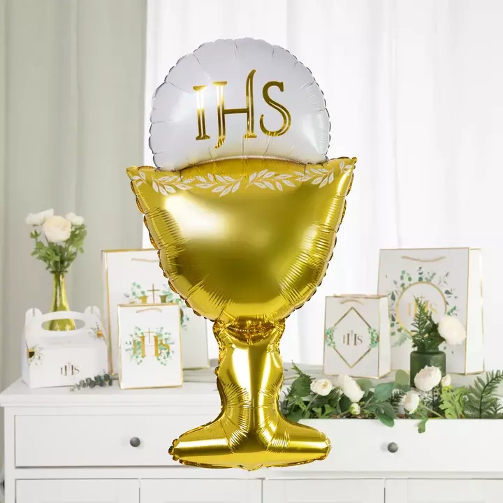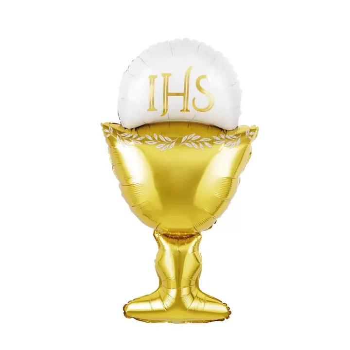 Balon w kształcie złotego kielicha z Hostią z pewnością zachwyci wszystkich uczestników przyjęcia i będzie stanowił przepiękną dekorację lub dodatek do prezentu komunijnego.