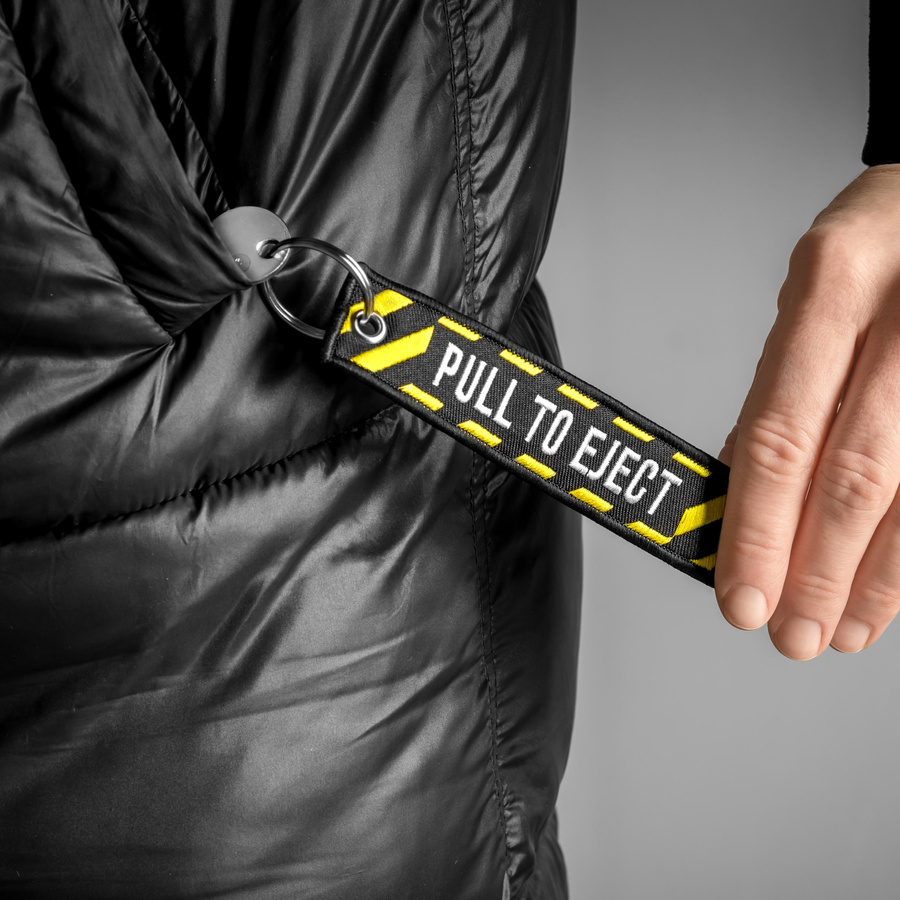 Solidny tekstylny brelok z wyhaftowanym z dwóch stron tekstem  PULL TO EJECT w nawiązaniu do znanych obrębie lotnictwa sytuacji, gdy pilot musi pociągnąć za uchwyt, by się katapultować i ocalić życie, zanim samolot się rozbije. Idealnie sprawdzi się jako zawieszka na klucze do domu lub samochodu czy na pendrive, kartę dostępową itd.