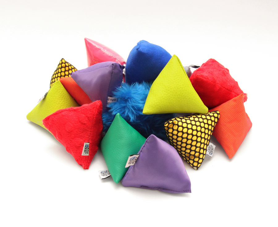 - Zestaw zawiera 20 szt. (10 par) woreczków sensorycznych w kształcie piramidek. 10 różnorodnych faktur. Cena za zestaw.