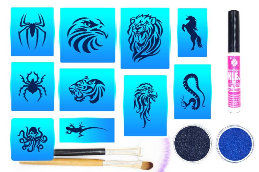 Zestaw szablonów zawierający wszystkie potrzebne produkty do wykonania tatuaży brokatowych.