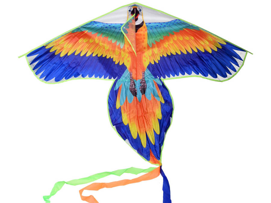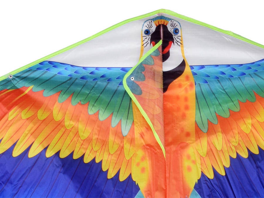 - Latawiec w kształcie papugi, wykonany z nylonowego materiału. Linka z uchwytem w zestawie. Wymiary: 160 x 115 x 40 cm z ogonem o długości 140 cm.