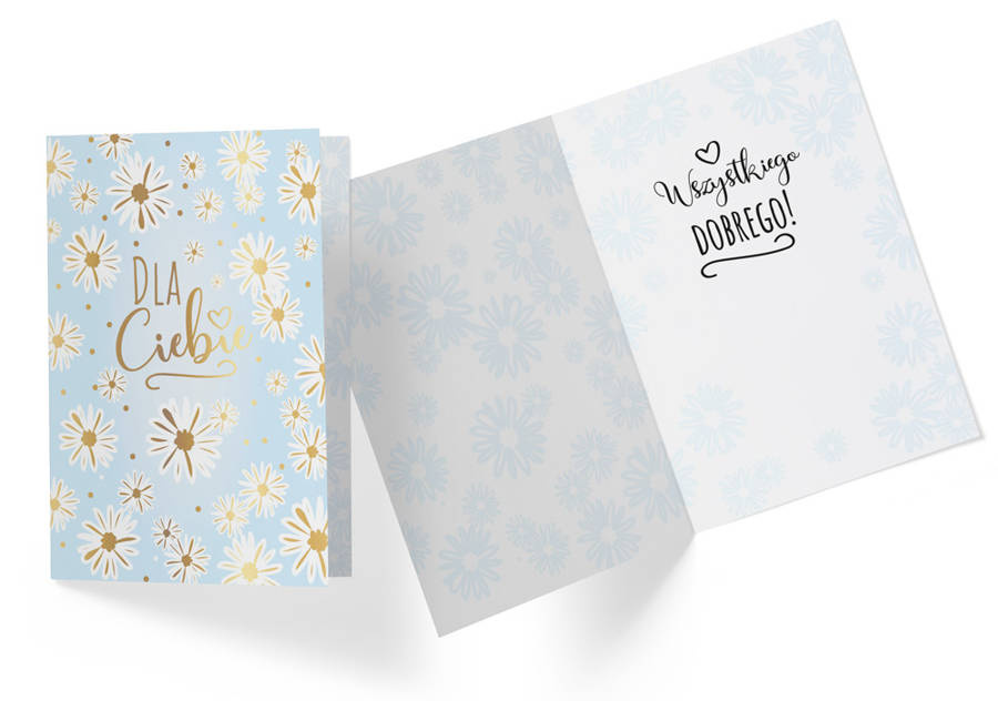 Kartka wielkości B6, zdobiona metaliczną folią. Kartka posiada kolorowe życzenia w środku i kopertę, a także miejsce na wpisanie własnych życzeń.
