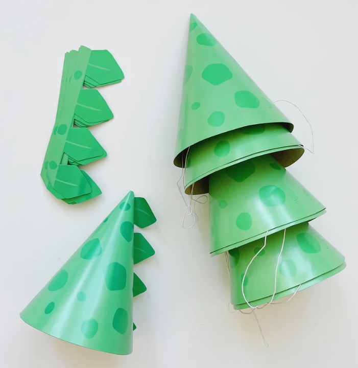 Zielone, składane czapeczki papierowe w kształcie stożka, z motywem dinozaurów.