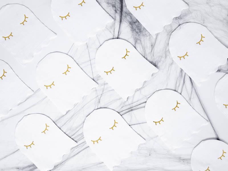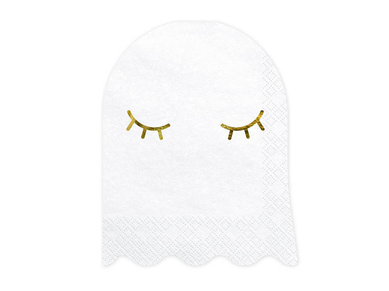 Papierowe, białe serwetki w oryginalnym kształcie ducha, ze złotym metalizowanym nadrukiem.