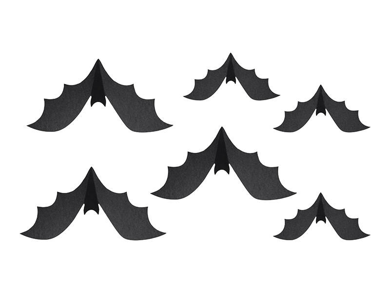 • Dekoracja papierowa Nietoperze w kolorze czarnym. Zestaw zawiera 6 sztuk. Wymiary ok. 19 x 8.7 - 29 x 13 cm. Cena za opakowanie.