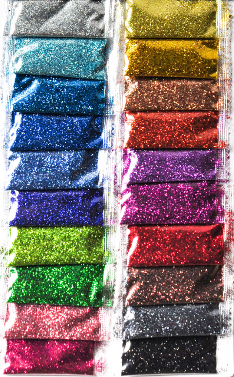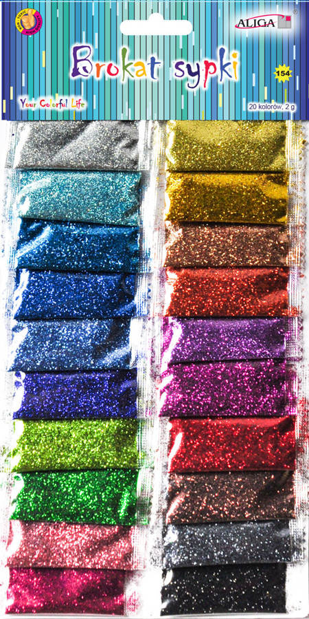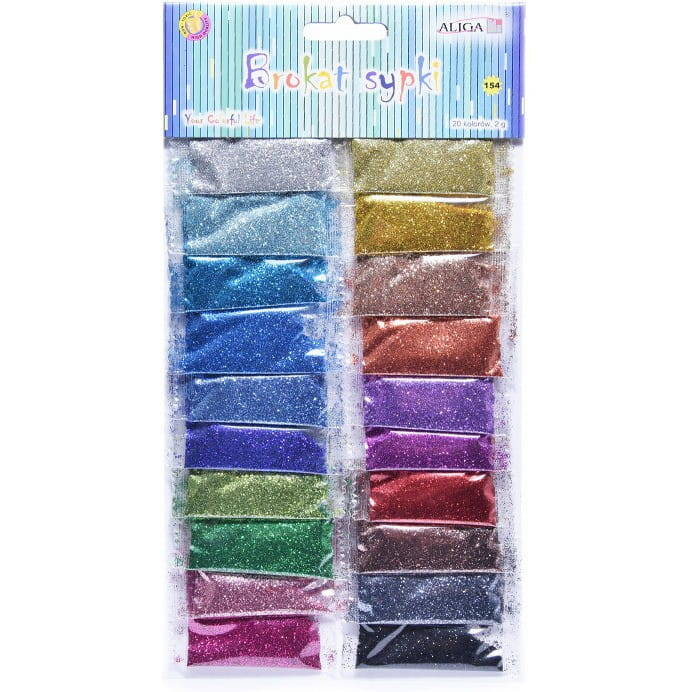 W zestawie 20 kolorów. Każdy kolor to osobny woreczek o pojemności 2g.