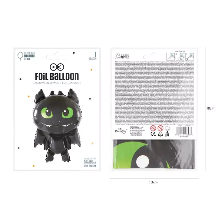 - Balon foliowy przypominający uroczego smoka. Idealna dekoracja na halloween. Wymiary 86 x 56 cm. Cena za sztukę.