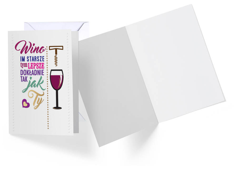 • Elegancka biała kartka z kolorowym nadrukiem i złotymi detalami, przedstawiająca kieliszek wina i napis "Wino - im starsze, tym lepsze - dokładnie tak jak Ty!" Wymiary: 16,6 x 11,7 cm. Z kopertą i życzeniami w środku. Cena za sztukę.