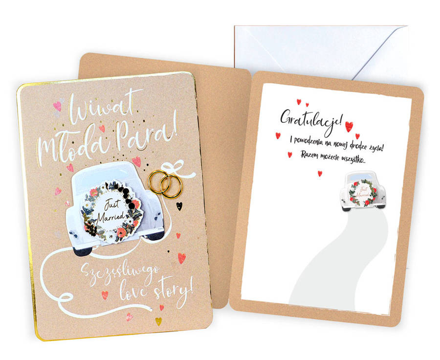 Kartka jest utrzymana w naturalnej kolorystyce kraftowej i białej, co nadaje jej rustykalnego uroku i elegancji. Na froncie kartki znajdziesz delikatny nadruk samochodu oraz piękne kwiaty, które symbolizują miłość, romantyzm i nowy rozdział w życiu pary młodej.