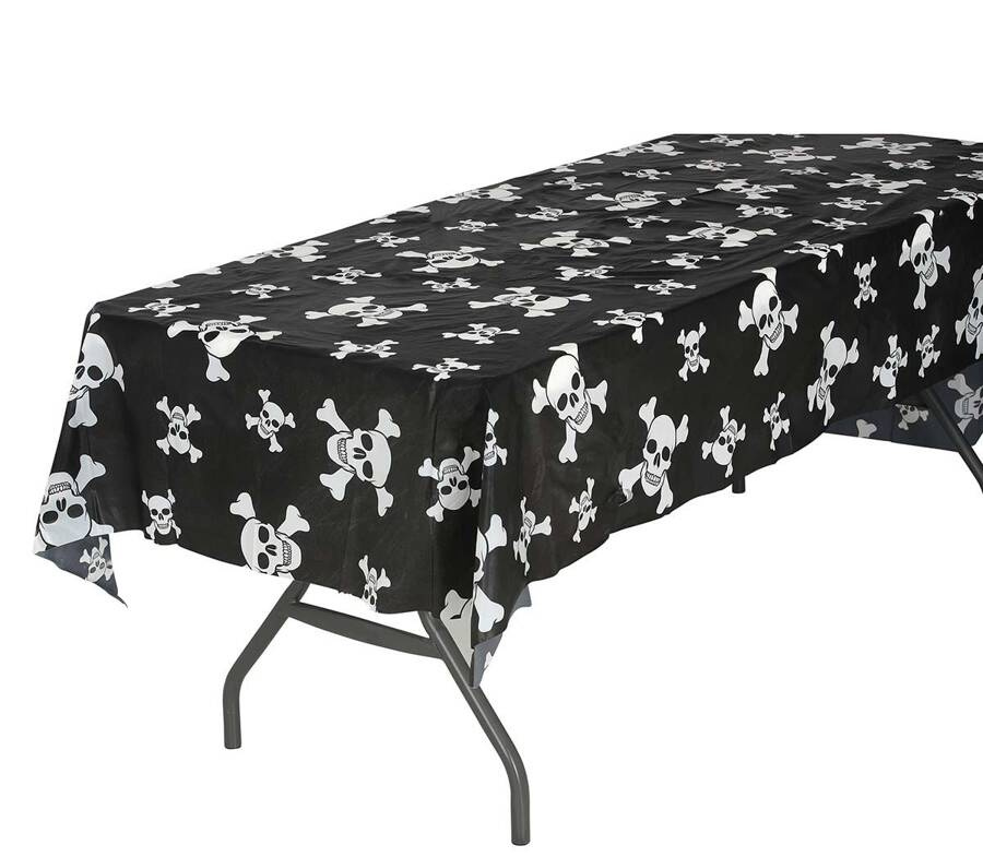 - Obrus na stół w czarnym kolorze z nadrukiem białych czaszek ze skrzyżowanymi piszczelami. Doskonały w czasie Halloween! Wielokrotnego użytku. Wymiary: 137x274 cm. Cena za sztukę.