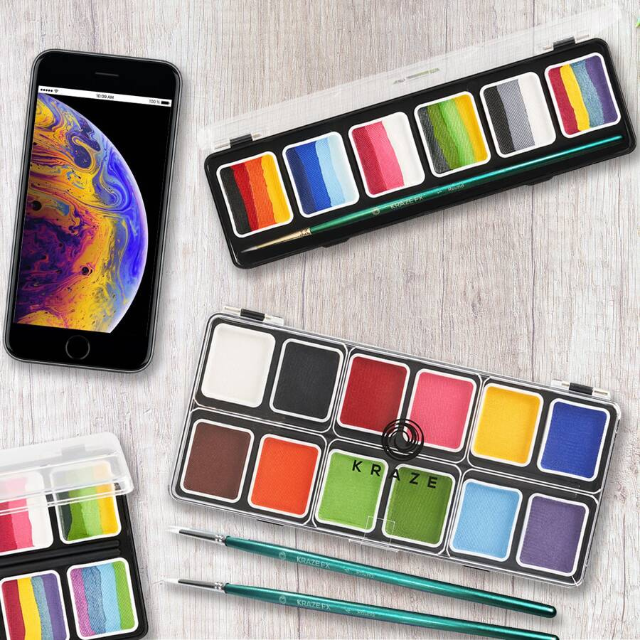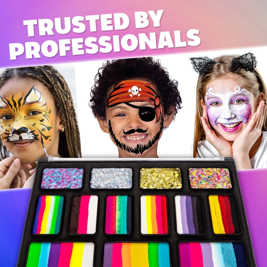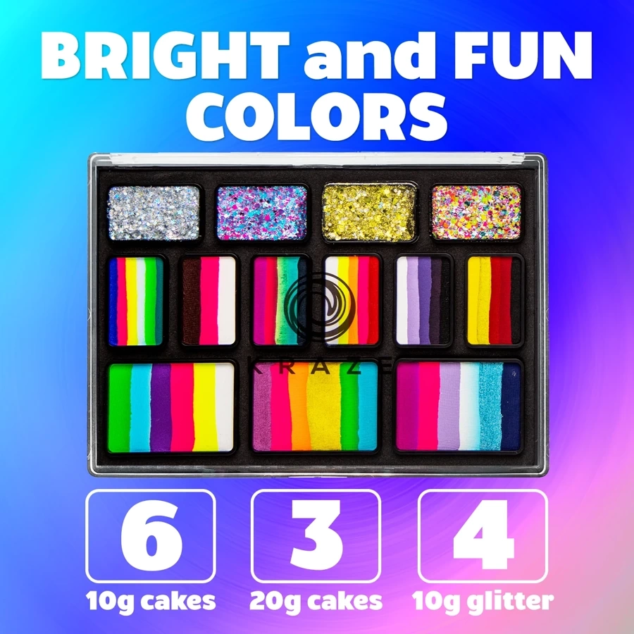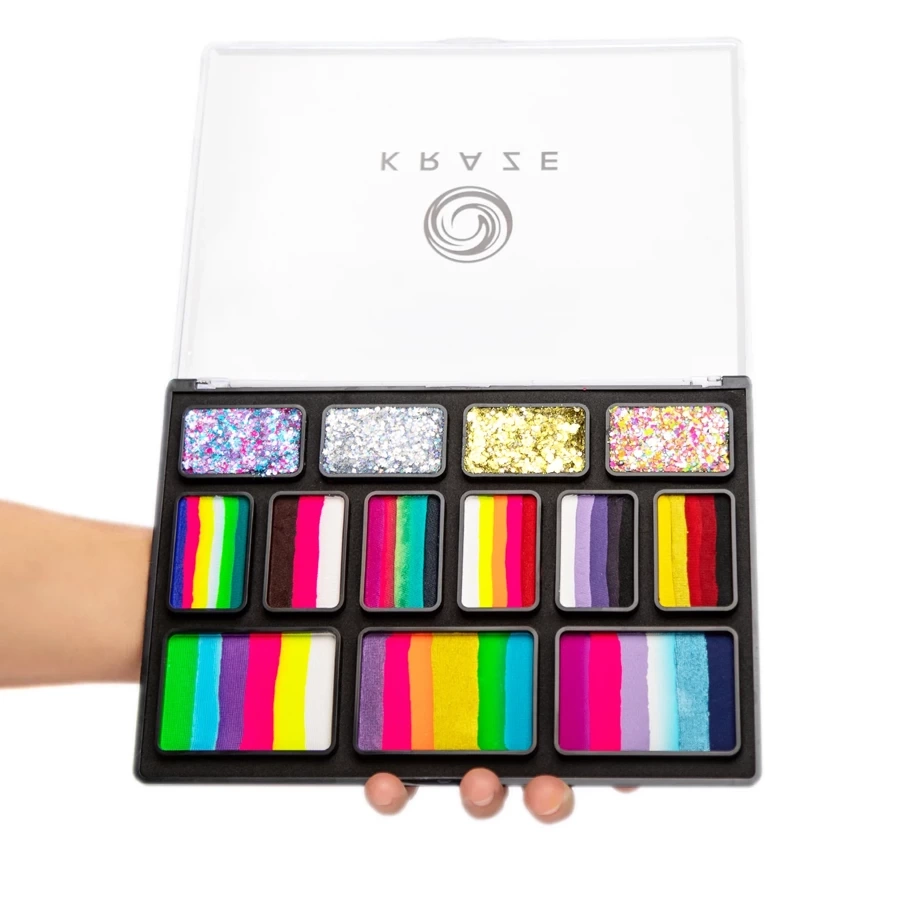 • Profesjonalne farby do malowania twarzy i ciała marki KRAZE wraz z brokatami VIVID Gleam Glitters.