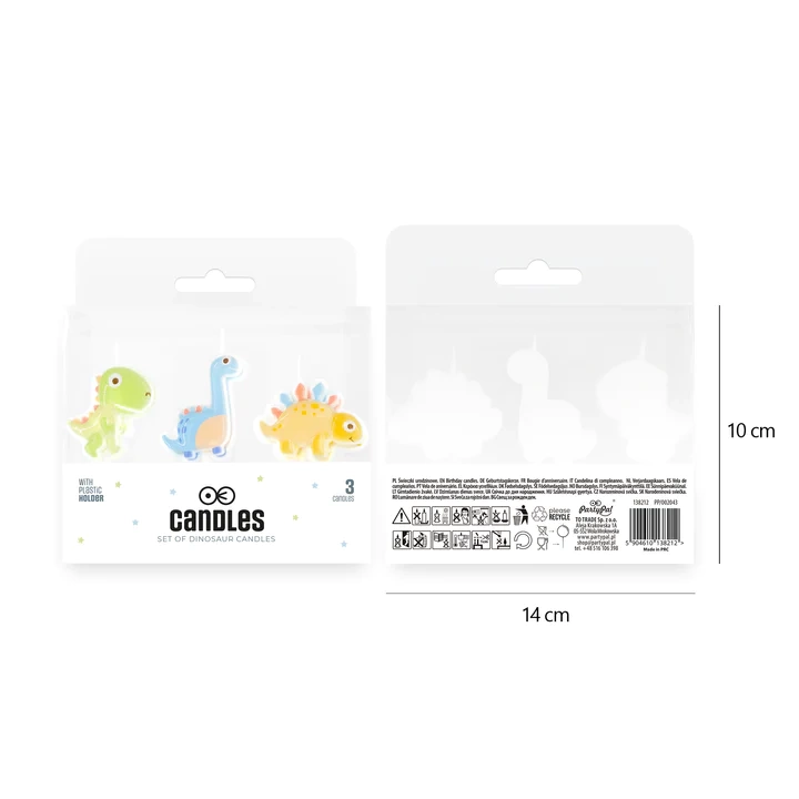 - Oświetl urodziny dziecka niezwykłymi świeczkami urodzinowymi Dinozaury. Trzy świeczki na plastikowych pikerach, każda przedstawia innego dinozaura. Wysokość 4-5 cm. Idealne dla chłopców i dziewczynek. Ceba za zestaw 3 szt.