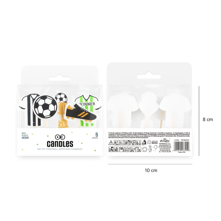 - Oświetl urodziny Twojego dziecka w sportowym stylu dzięki naszym uroczym świeczkom urodzinowym Football. Zestaw 5 świeczek na drewnianych pikerach o wysokości 2-4 cm. Idealne dla małych fanów piłki nożnej! Cena za zestaw.