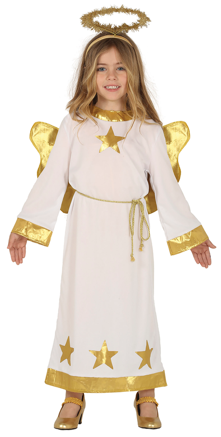 - W skład stroju wchodzi: długa sukienka z gwiazdkami z długim rękawem wykończona złotym materiałem, złote skrzydełka z materiału oraz złoty sznurek.