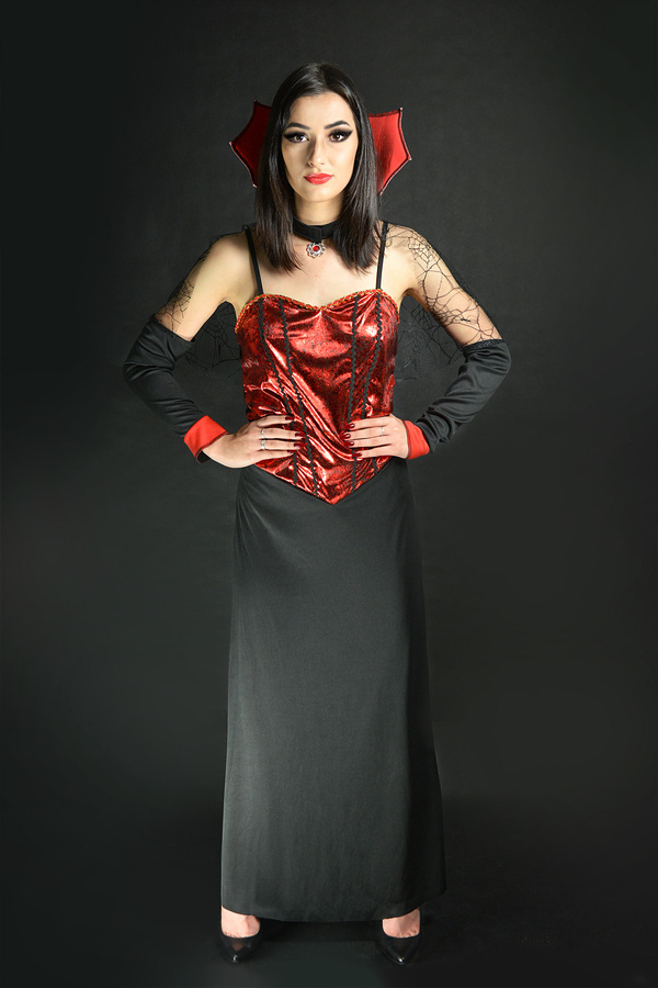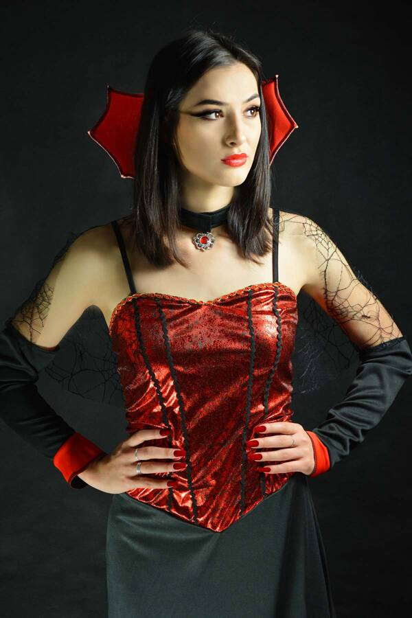 Ten kostium wampirzycy został starannie zaprojektowany, aby odzwierciedlić klasyczną estetykę wampirów. Zaczynając od usztywnianego kołnierza, który dodaje uroku i dramatycznego wyrazu twarzy, po ciemne, gotyckie akcenty na sukience, ten strój zachwyci każdego swoim wyglądem.