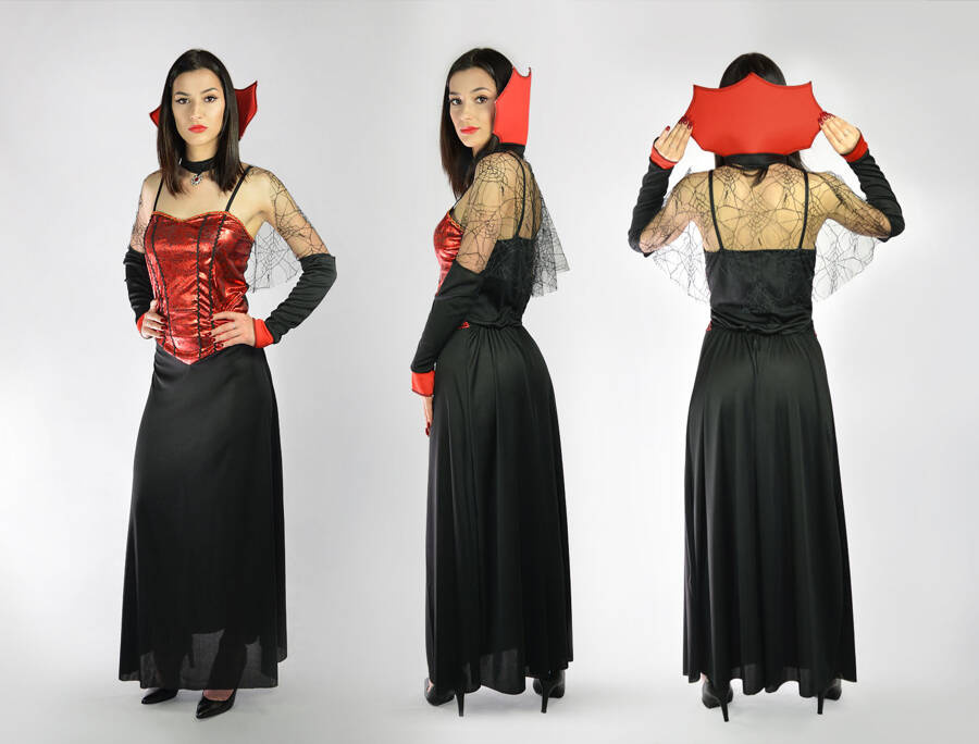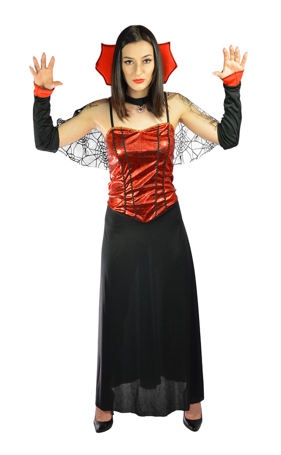 - Zestaw zawiera długą sukienkę na ramiączkach oraz efektowny kołnierz z rękawami. Ta czarna suknia z czerwonym gorsetem i kołnierzem z pajęczyną to wspaniała opcja na nietypowy strój imprezowy.