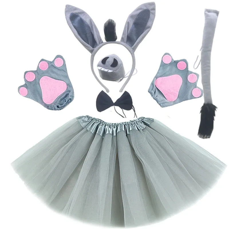 - Przebranie osiołka dla dzieci to idealny wybór na różne okazje. Zapewnia wygodę i realistyczny efekt. Składa się aż z 7 elementów: spódniczki, opaski z uszkami, rękawiczek, opaski na nos, ogona, muszki. Cena za komplet.