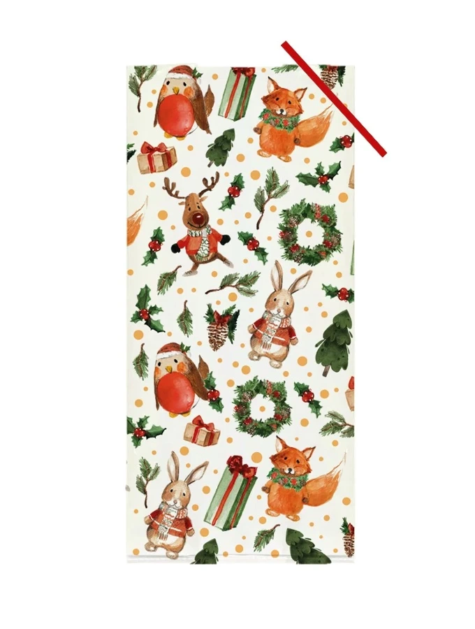 - Urocze woreczki celofanowe na słodkości z motywem bożonarodzeniowym w leśne zwierzątka. Zestaw 20 sztuk o wymiarach 12,5 x 28,5 cm z metalicznym zapięciem twist tie. Idealnie nadają się do pakowania prezentów i przekąsek.