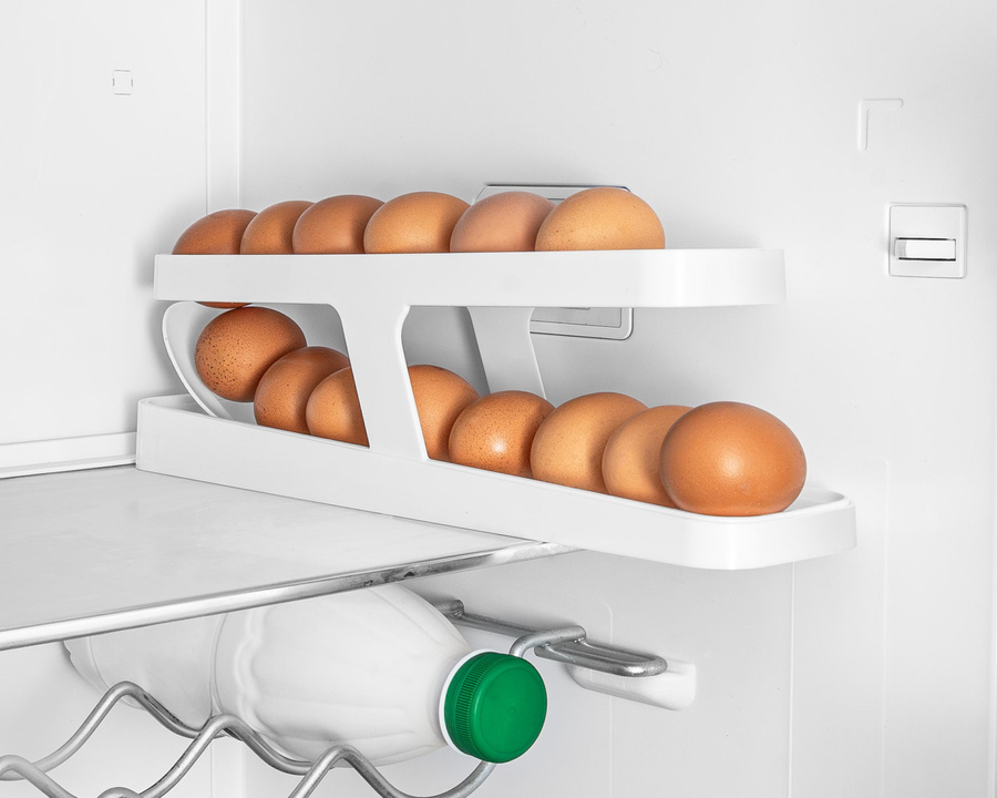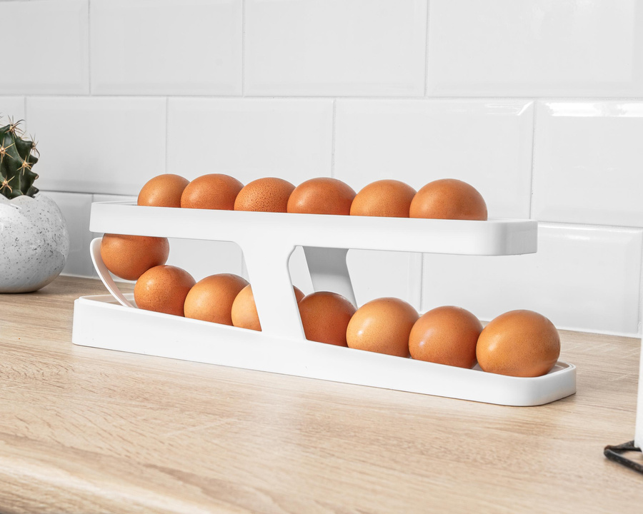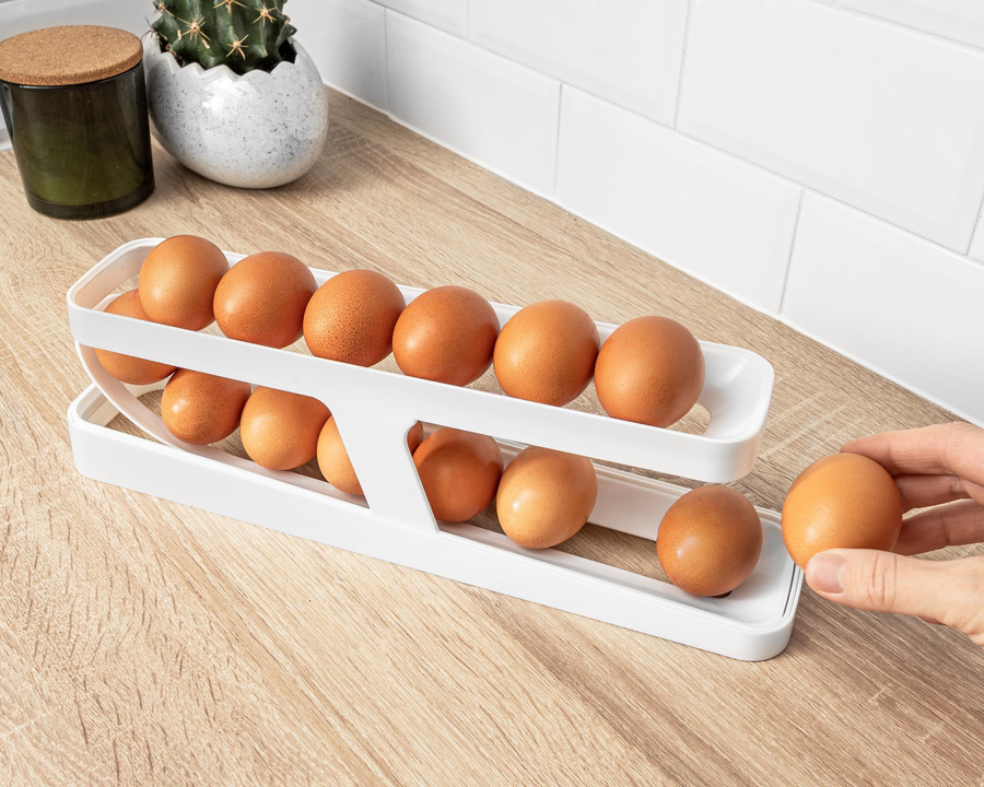 Każdy z nas ma od czasu do czasu problem z miejscem w lodówce, niezależnie od tego, jak duża by nie była. Są różne sposoby na radzenie sobie z tym wyzwaniem, ale nasze wydaje się wyjątkowo ciekawe i praktyczne. Wypróbuj nasz dwupoziomowy automatyczny podajnik na jajka, by przekonać się, jak zadbać o więcej luzu w lodówce :). Wygoda i oszczędność miejsca w jednym, pojemnik pomieści aż do 14 jajek, które w dodatku będą automatycznie się przesuwać. Pamiętajcie jednak, żeby wkładać jajka słusznej wielkości, bo te malutkie lubi turlać się po swojemu ;) Wystarczy załadować podajnik jajkami, zaczynając od dołu, w ilości 12-14 szt., w zależności od wielkości i już można podbierać sobie jajeczko po jajeczku, które będą się samoczynnie dzięki grawitacji turlać.