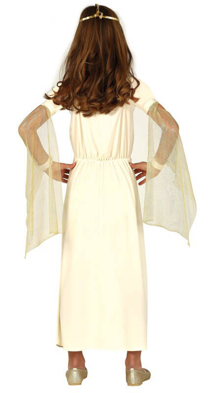 - Strój antyczny dla dziewczynki w formie kremowej sukienki ozdobionej złotymi tasiemkami. Wygodny fason sukienki przeniesie w antyczny świat Grecji czy Rzymu.