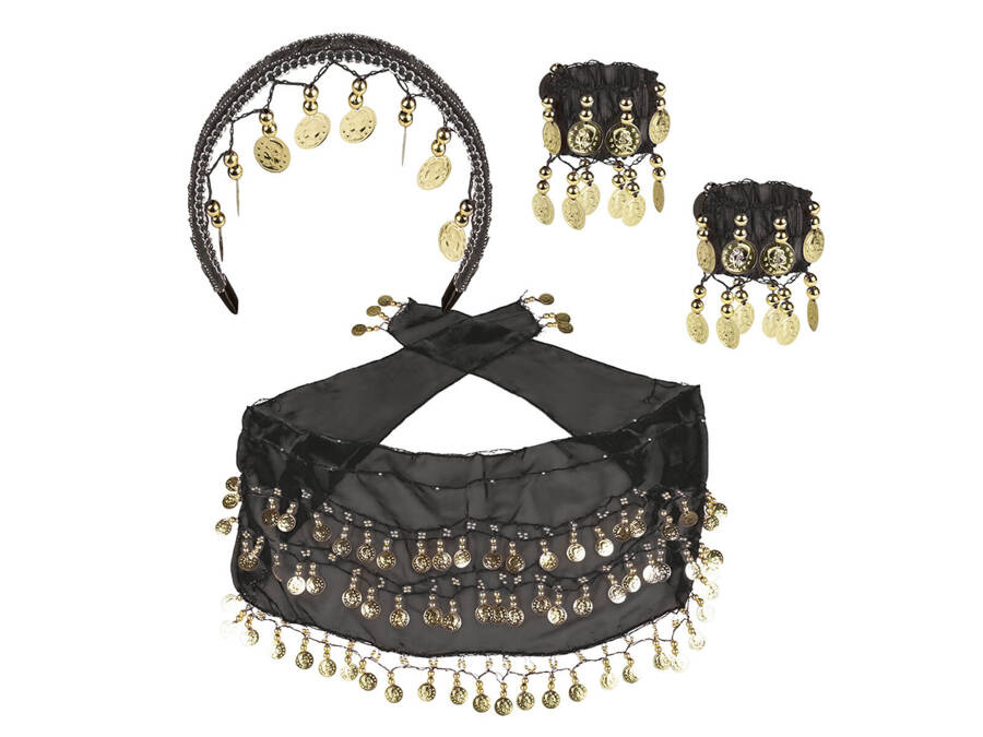 Całość wykończona złotymi monetami, które delikatnie mienią się w świetle, podkreślając piękno każdej tancerki. Przepaska na biodra nadaje się doskonale do tańca brzucha. Całość zestawu utrzymana jest w eleganckim, głębokim kolorze czarnym, co dodaje tajemniczości i klasy każdemu strojowi.